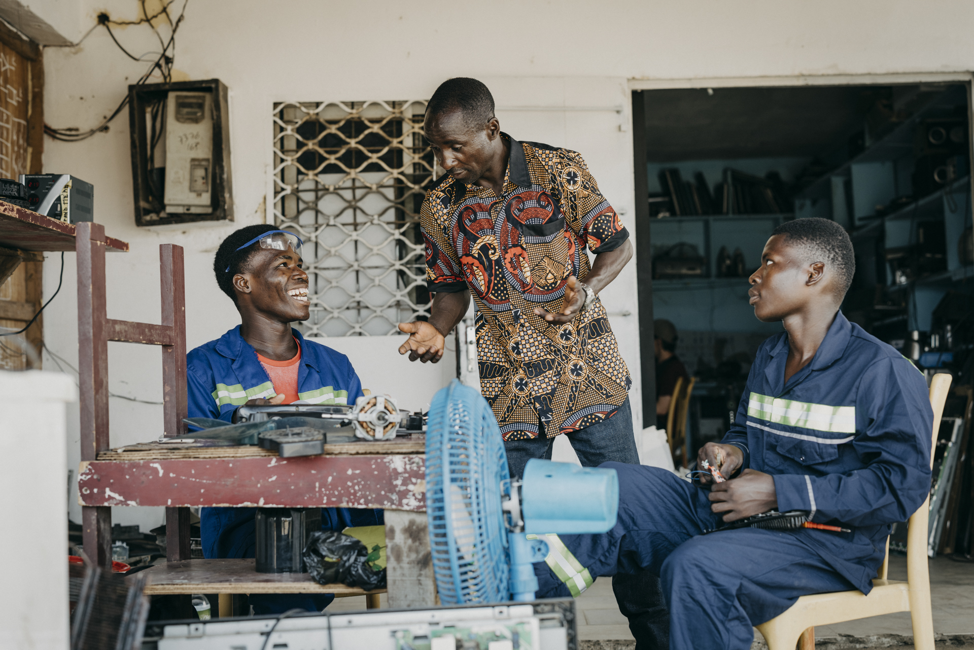 Priorität hat ohnehin eine andere Reparatur: Azubi Ulrich Gansop, der große Bruder von Silas, nimmt einen Ventilator entgegen, den ein Nachbar vorbeibringt. Es ist heiß und die Angelegenheit daher dringend. Ulrich untersucht ihn vorsichtig, als handele es sich um ein lebendiges Wesen. Dann schraubt er das Gerät auseinander, um dem Defekt im Inneren nachzugehen. Elektrotechnik hat ihn schon als kleines Kind begeistert. „Ich wollte jedes technische Gerät öffnen und hineinschauen“, sagt der 21-Jährige.