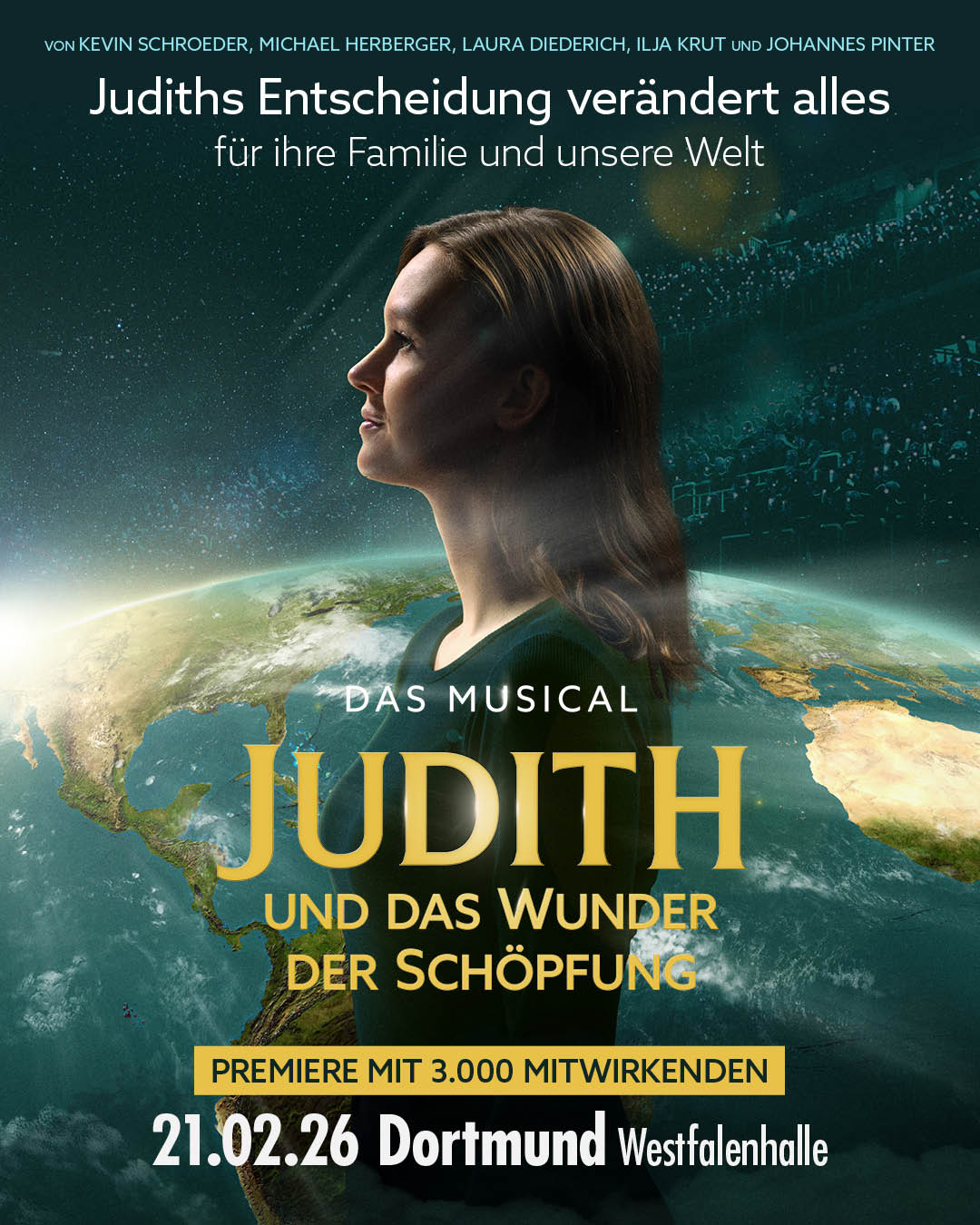 „Judith und das Wunder der Schöpfung“ punktet nicht nur mit Stimmgewalt, sondern auch mit einer eindrucksvollen Inszenierung. Modernste Bühnentechnik und eine 200 Quadratmeter große Videoleinwand sorgen dafür, dass die beiden Vorstellungen in der großen Westfalenhalle insgesamt rund 15.000 Menschen in ihren Bann ziehen werden. Bevor das Musical 2027 auf Tournee geht, ist dies die einzige Möglichkeit in NRW, die Show live zu erleben. Die Liebesgeschichte zwischen Judith und Ammo führt mitten hinein in Fragen, die viele heute bewegen – und zeigt Wege auf, trotz Unterschiedlichkeit gemeinsam zu handeln.
