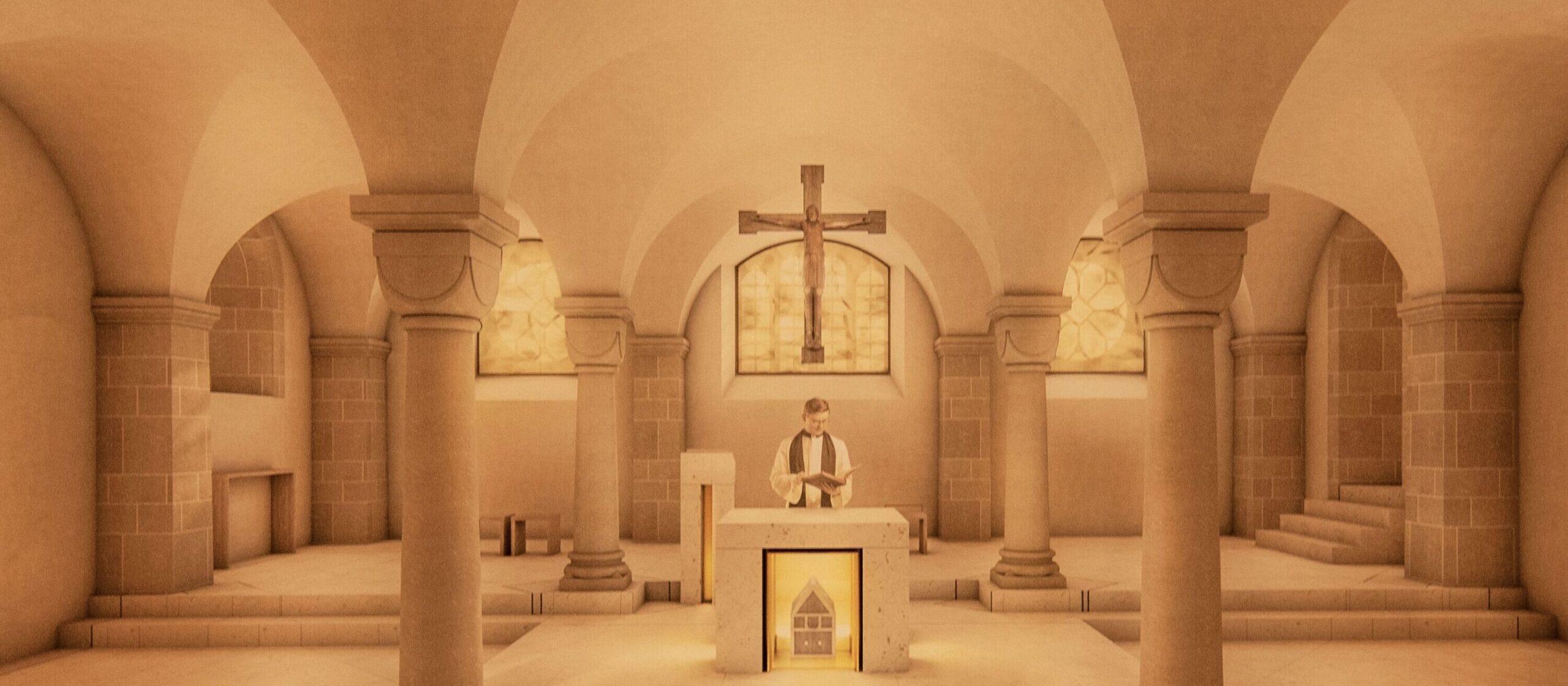 Das Erste, was mir auffällt, als ich am Fuß der Treppe ankomme, ist: Die Krypta ist sehr … beige. Der Boden mit seinen hellen Sandsteinplatten, der Altar und die sandfarben getünchte Decke. Ich verharre einen Moment. Wie fühlt sich das an? Warm. Es hat etwas von den Kirchen des Heiligen Landes oder von denen des französischen Mittelmeerraumes – die zweite Assoziation wird durch die Bestuhlung mit ihren geflochtenen Sitzflächen noch verstärkt. Hell, warm, auf das Wesentliche reduziert.