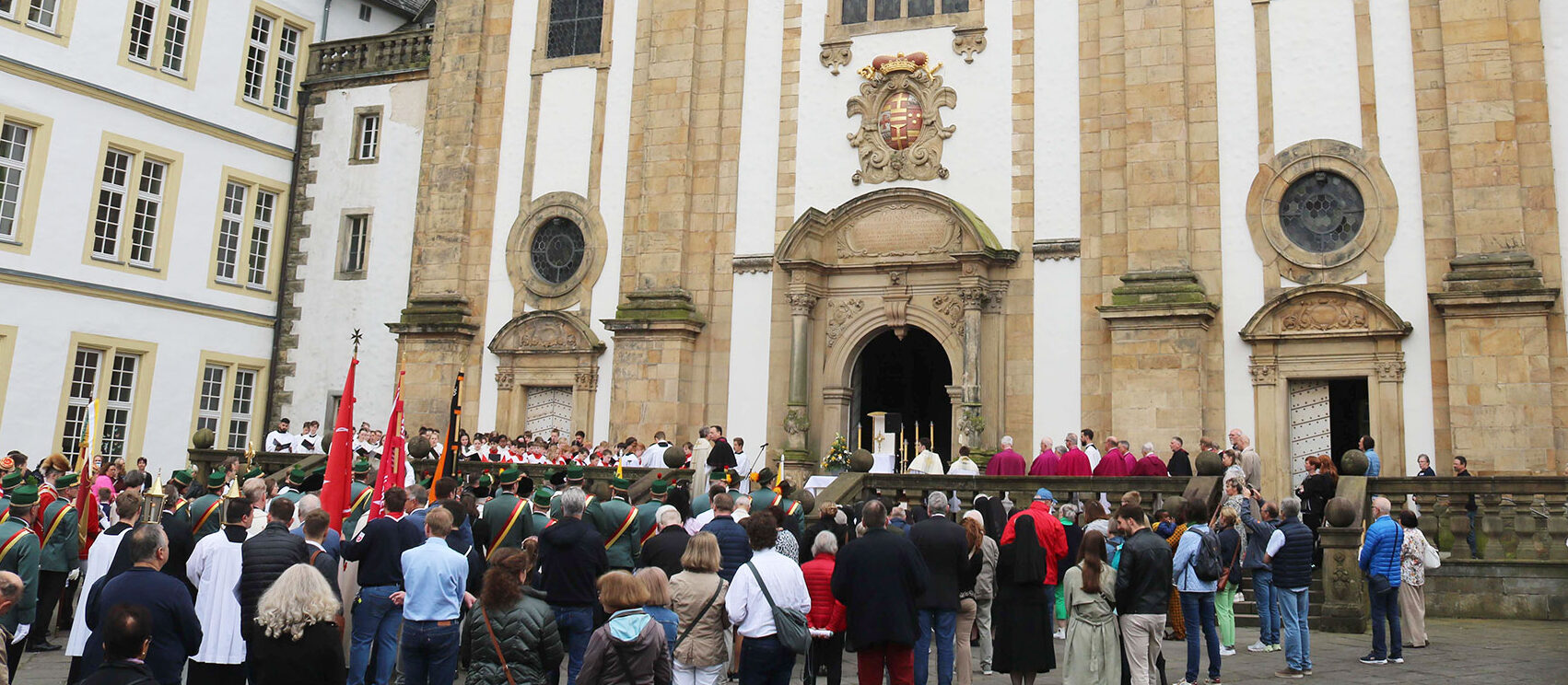 Bewegende Worte sprach der Erzbischof zuvor in der Bischofskirche des Erzbistums Paderborn. Zentrales Bild war dabei das Brot: „Wenn wir mit dem Fronleichnamsfest das Brot im Zeichen des Sakramentes verehren, dann werden wir im Schauen auf dieses Brot daran erinnert: Ich bin Geschöpf in der Hand des Schöpfers. Gott weiß um meine Bedürftigkeit. Gott weiß um meinen Hunger“, so Dr. Udo Markus Bentz in seiner Predigt. Das Brot stehe zudem sinnbildlich für das Wirken des Menschen auch in heutiger Zeit: „Sich verwandeln lassen, zur Einheit finden, die Egoismen überwinden und das Gemeinsame suchen – das alles steckt in diesem sakramentalen Zeichen des Brotes.“ Fronleichnam sei auch das Bekenntnis dazu, „dass Gott uns und die Welt in Einheit zusammenführen will. Die Zerrissenheit in so viele Eigeninteressen, die Egoismen und partikulare Interessen, durch die der Zusammenhalt in unserer Gesellschaft so sehr bedrängt ist: Mit Fronleichnam und in der Feier der Eucharistie bekennen wir uns dazu, dass wir nur dann eine Zukunft haben, wenn es uns gelingt dieses Auseinanderdriften verwandeln zu lassen auf Einheit hin, auf ein neues Miteinander hin“, unterstrich der Paderborner Erzbischof. Bezogen auf die auf die Heilige Messe folgende Prozession formulierte er, dass diese „ein Zeichen der Solidarität mit der Stadtgesellschaft“ sei.
