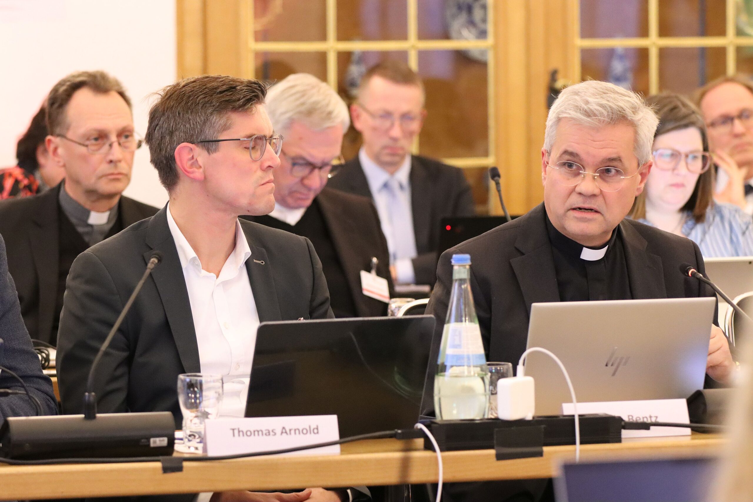 Auch der Vorsitzende der Deutschen Bischofskonferenz, Bischof Dr. Georg Bätzing, zeigte sich zufrieden: „Das ist ein großartiger Moment, auch ein Stück historisch. Der Weg bis hierher hat viel Arbeit im Vorfeld bedeutet, auch im Gespräch mit Rom. Mir fällt ein großer Stein vom Herzen und die Einstimmigkeit zur Satzung zeigt auch, wie sehr wir zusammengefunden haben durch die Arbeit im Synodalen Ausschuss. Es war ein Weg in Deutschland und mit der Weltgemeinschaft der Kirche. Wir haben es hier geschafft, wichtige Schritte von Partizipation, Transparenz, Rechenschaft, gemeinsamem Beraten und Entscheiden voranzugehen.“ Ausdrücklich wandte sich Bischof Bätzing an jene Bischöfe, die aus dem Prozess des Synodalen Weges ausgestiegen sind: „Es ist mein Wunsch, dass am Ende auch alle mitwirken wollen und können. Um es ehrlich zu sagen: Wir haben aus den Erfahrungen des Synodalen Weges gelernt, da gab es auch Verletzungen und die kritische Frage, ob Minderheiten ernstgenommen wurden. Die jetzigen Erfahrungen im Ausschuss haben zu einem anderen Miteinander geführt und Wege ermöglicht, Fragen gemeinsam zu klären. Wir können uns einander zumuten in der unterschiedlichen Verantwortlichkeit. Aber wir wissen, im Ziel gehen wir zusammen. Das ist etwas, das prägt, das macht es konstruktiv“, so Bischof Bätzing.