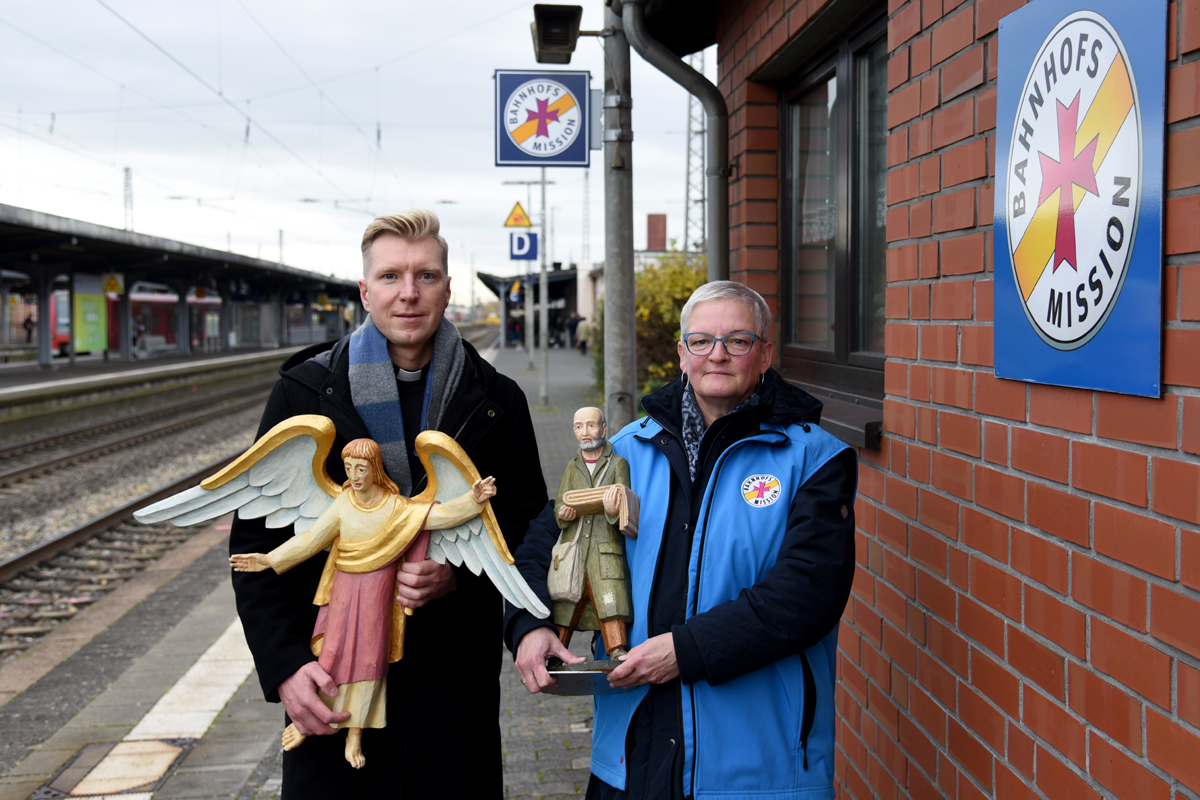 „Der Advent hat viele Bezüge zur Bahnhofswelt: Es geht um das Warten, um das Finden des richtigen Gleises im Leben, die Hoffnung, dass die Weichen richtig gestellt werden und schließlich die Ankunft des Langerwarteten“, sagt Dompastor Dr. Nils Petrat für das Paderborner Metropolitankapitel. Da ist es ein sinnfälliges Zeichen, dass der Obdachlose und der Engel von der Krippe des Paderborner Domes zum Auftakt der Solidaritätsaktion vom Dompastor zur Bahnhofsmission Paderborn gebracht werden. „Der Engel von der Krippe trifft hier am Bahnhof die ‚blauen Engel‘ von der Bahnhofsmission“, scherzt Sabine Bergmaier und merkt an, dass die Mitarbeiter der Bahnhofsmission oftmals als „blaue Engel“ bezeichnet werden. Der „Bahnhof“ wird aber auch an der Krippe des Paderborner Domes abgebildet werden, denn dazu werden „Andreas-Kreuze“ dort aufgestellt.