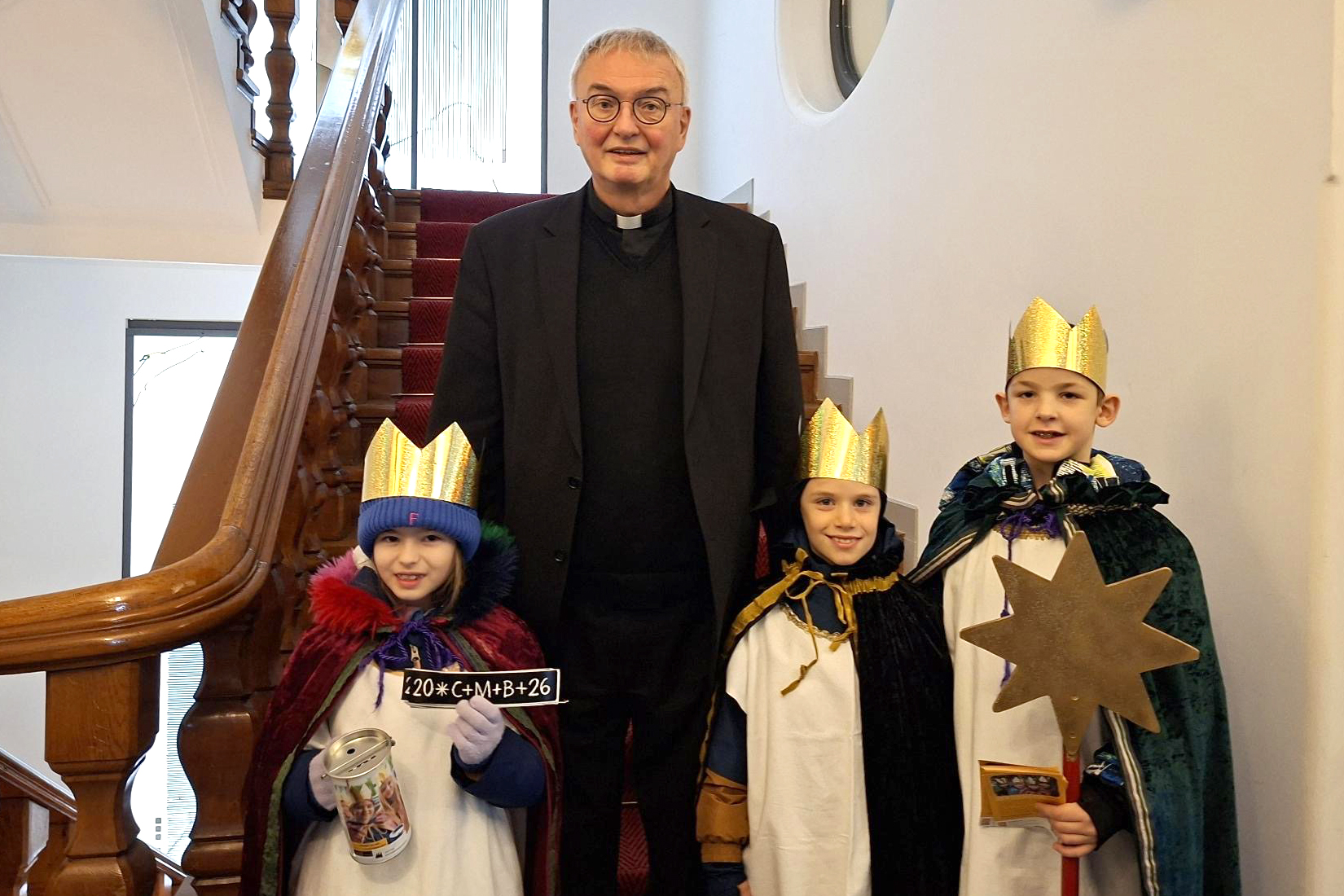 Am Festtag der Heiligen Drei Könige, Dienstag, 6. Januar 2026, brachten Sternsingerinnen und Sternsinger der Pfarrei St. Liborius Paderborn den traditionellen Segen „Christus mansionem benedicat – Christus segne dieses Haus“ zu Generalvikar Thomas Dornseifer und allen Mitarbeitenden des Erzbischöflichen Generalvikariats. „Am Beginn eines neuen Jahres persönlich und als Einrichtung einen Segen zu empfangen, tut gut und stellt die kommende Zeit, Tage und Monate, von vorneherein unter einen guten und hoffnungsvollen Stern“, dankte Generalvikar Dornseifer den „Hoffnungs- und Segensboten“ für ihr Engagement. Der Generalvikar von Erzbischof Dr. Udo Markus Bentz würdigte zugleich den Einsatz der Sternsinger „von Kindern für Kinder“: „Ihr tut nicht nur uns Erwachsenen mit eurem Dreikönigssingen gut, sondern setzt euch zugleich für andere Kinder ein. So wie Ihr uns hier im Erzbischöflichen Generalvikariat den Segen bringt, seid Ihr zugleich ein Segen für viele andere Menschen.“ Mit Generalvikar Thomas Dornseifer freuten sich Mitarbeitende der Verwaltungsbehörde des Erzbistums über den Besuch von Frida, Anton und Leo – Caspar, Melchior und Balthasar – als Sternsingerinnen und Sternsinger.