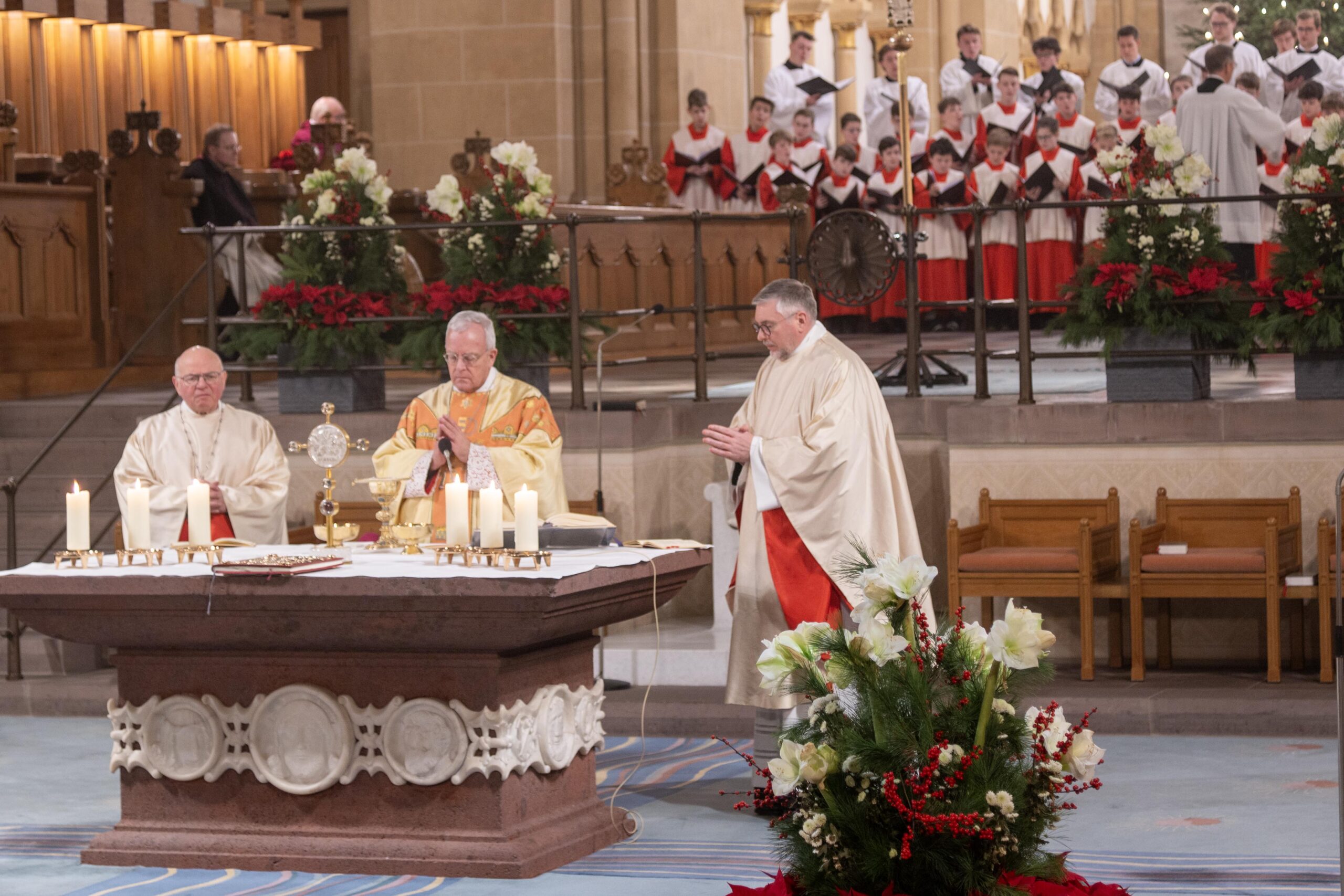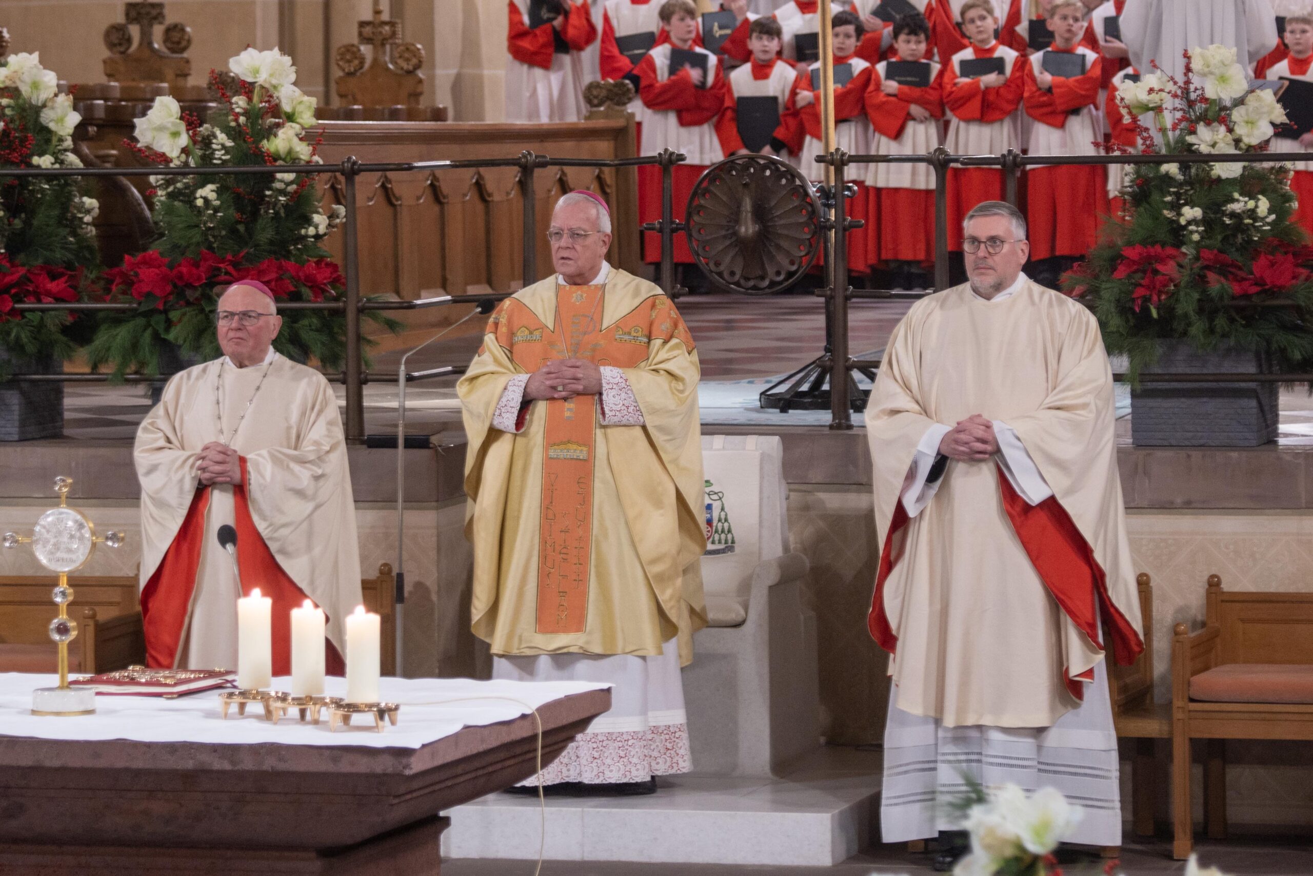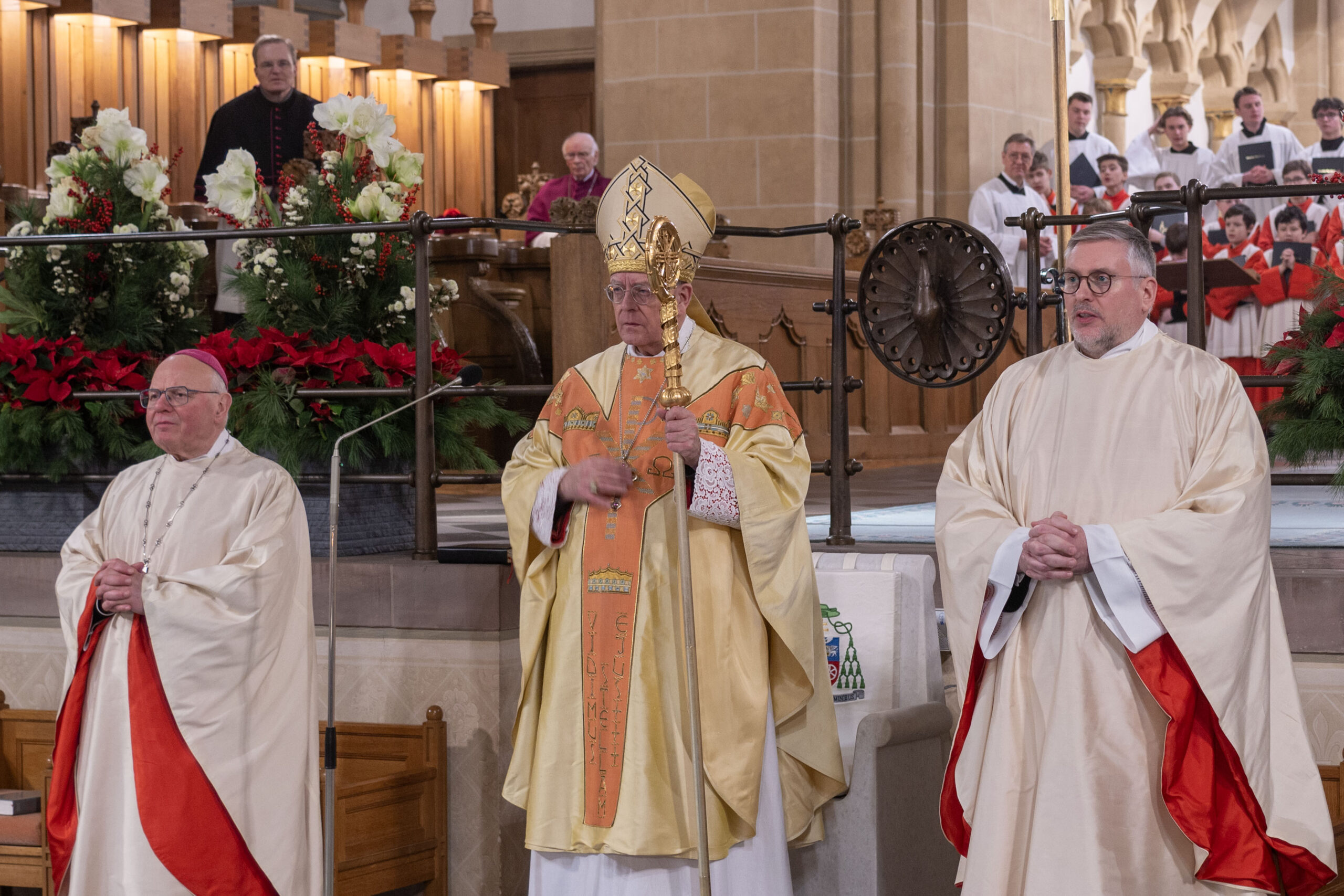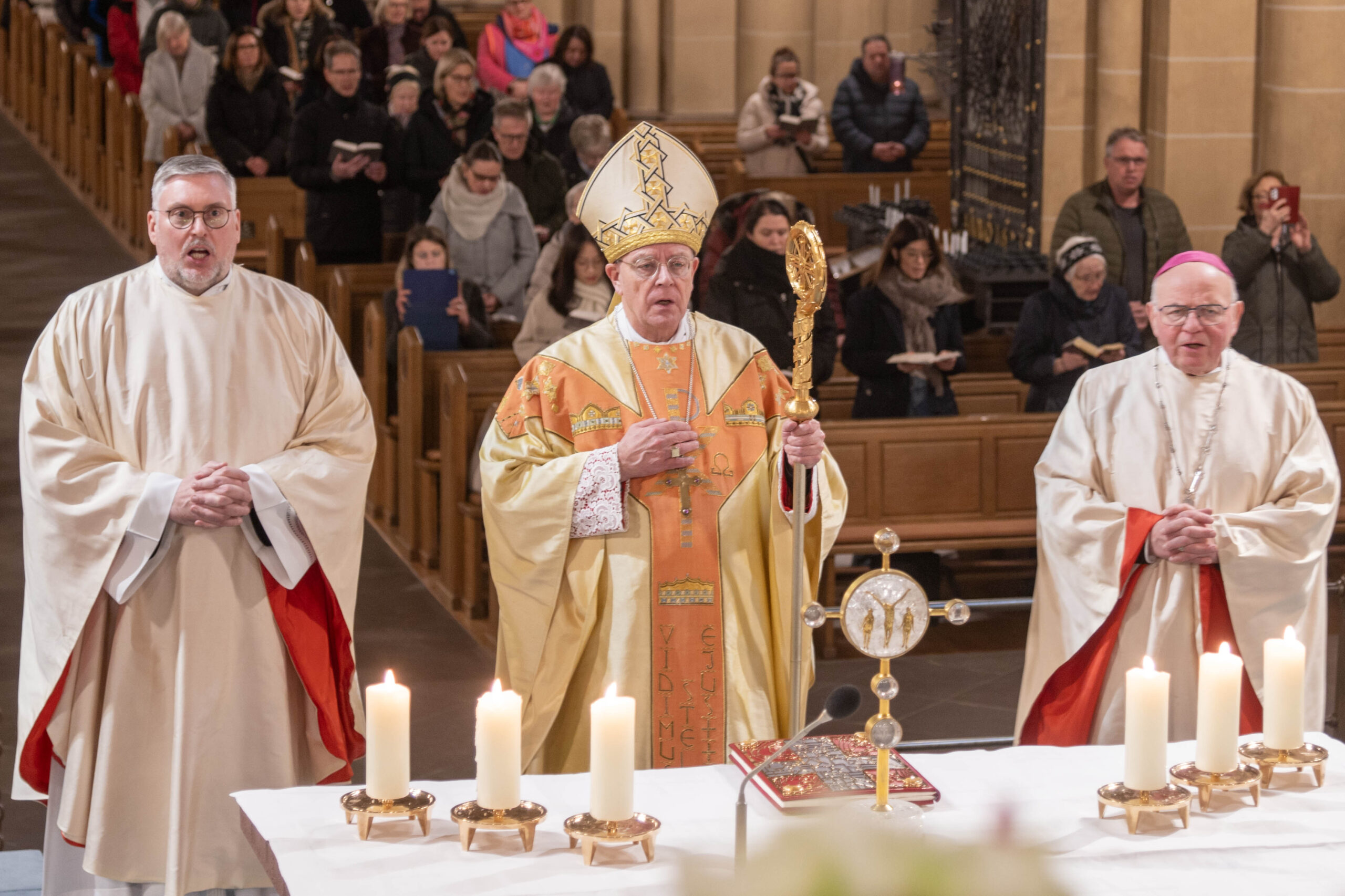 Weihbischof Matthias König rief am Hochfest der Erscheinung des Herrn (Epiphanie) dazu auf, sich von Jesus Christus berühren zu lassen und sich für ihn zu öffnen. „Jesus Christus will bei uns ankommen. Seine Herrlichkeit will uns erreichen und berühren. Sie will in uns eindringen und uns verwandeln“, bekräftigte Weihbischof König in seiner Predigt im Pontifikalamt im Hohen Dom zu Paderborn. Weihbischof Hubert Berenbrinker und Offizial Markus Stadermann konzelebrierten im festlich gestalteten Gottesdienst. Die Katholische Kirche gedenkt am 6. Januar zugleich der „Heiligen Drei Könige“ oder der „Weisen aus dem Morgenland“, wie die im Matthäus-Evangelium (Mt 2) genannten Sterndeuter, die durch den Stern von Bethlehem zu Jesus geführt wurden, gedeutet werden.
