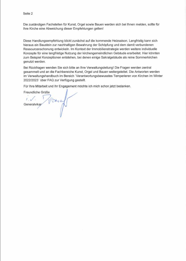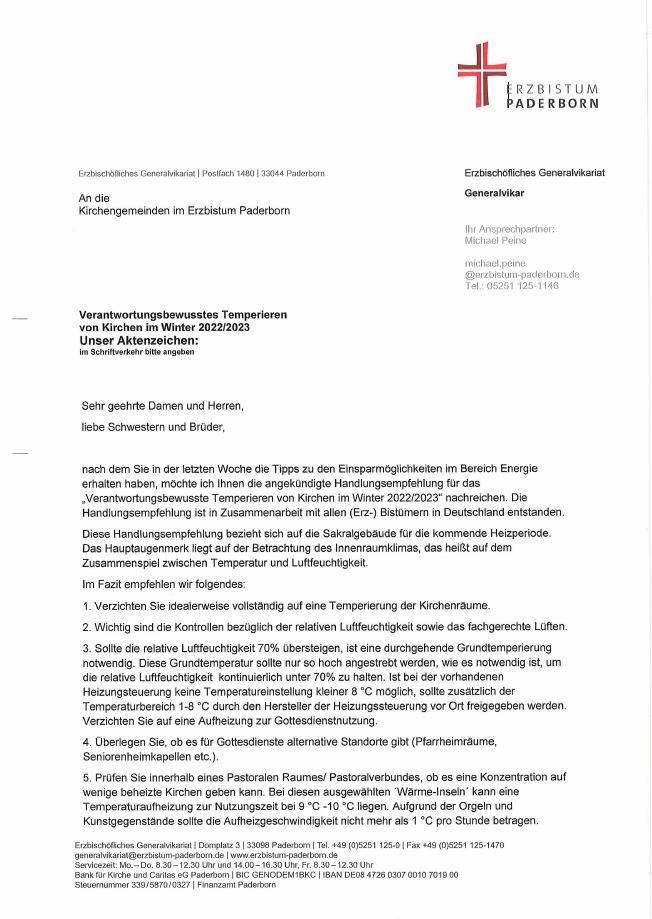 Wie Sie solch ein ausgeglichenes Raumklima schaffen können und welche weiteren konkreten Empfehlungen ausgesprochen werden, erfahren Sie in einer Kurz- sowie einer Langversion der „Handlungsempfehlungen zum verantwortungsbewussten Heizen von Kirchen“. Generalvikar Alfons Hardt weist hierbei ausdrücklich darauf hin, dass „diese Handlungsempfehlung zunächst auf die kommende Heizsaison blickt. Langfristig kann sich hieraus ein Baustein zur nachhaltigen Bewahrung der Schöpfung und der damit verbundenen Ressourcenschonung entwickeln.“