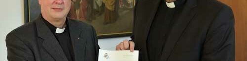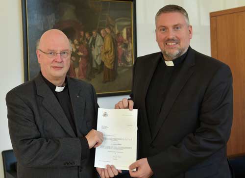 Vizeoffizial Markus Stadermann wurde von Erzbischof Hans-Josef Becker zum Domvikar ernannt. Generalvikar Alfons Hardt (links) überreichte ihm die Ernennungsurkunde.Foto: pdp / Thomas ThroenleErzbischof Hans-Josef Becker hat Vizeoffizial Markus Stadermann (44) zum Domvikar des Paderborner Metropolitankapitels ernannt. Neben seiner Tätigkeit als Diözesanrichter wird er die Aufgaben eines Domvikars am Hohen Dom zu Paderborn mit Wirkung zum 1. November 2018 wahrnehmen. Generalvikar Alfons Hardt überreichte ihm die Ernennungsurkunde. Stadermann folgt in der Funktion des Domvikars Pfarrer Ulrich Liehr, der im September von Generalvikar Alfons Hardt als Pfarrer der Pfarrei Jesus Christus in Lippetal und Leiter des gleichnamigen Pastoralen Raumes installiert wurde. Seit 2014 wirkt Stadermann als Vizeoffizial am Erzbischöflichen Offizialat Paderborn. Bereits 2011 wurde er zum Offizialatsrat ernannt. Als Diözesanrichter beschäftigt er sich seit 2009 insbesondere mit Ehenichtigkeitsverfahren des Erzbischöflichen Offizialates Paderborn.