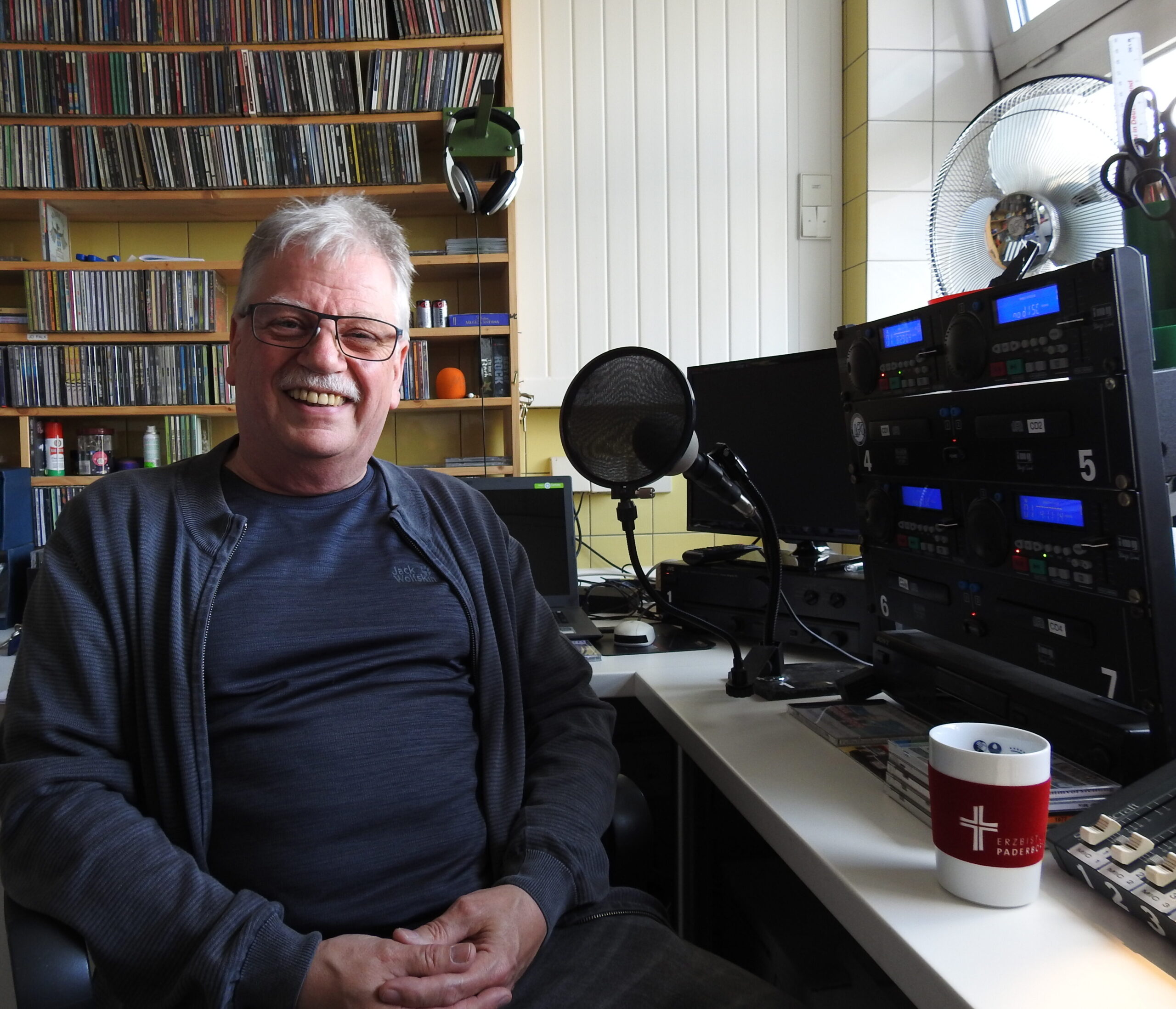 Der Weg zum Studio führt über einen Nebeneingang. Der Raum umfasst nicht mehr als 15 Quadratmeter. Ansonsten steht der Trakt leer, ehemals wurde hier gekocht und gebacken. Die deckenhohen Regale sind vollgestopft mit Tonträgern. Vor dem Fenster steht das technische Equipment. Mischpult, Mikrophone, ein CD-Player mit Kassettendeck und ein Plattenspieler, alle etwas in die Jahre gekommen, der Sender finanziert sich selbst. „Wir haben noch viel mehr Zeugs. Sämtliche Sendungen und ein Archiv mit über 50.000 Vinyls. Früher hatten wir so viel Platz, wie wir brauchten“, sagt Rainer Müller.