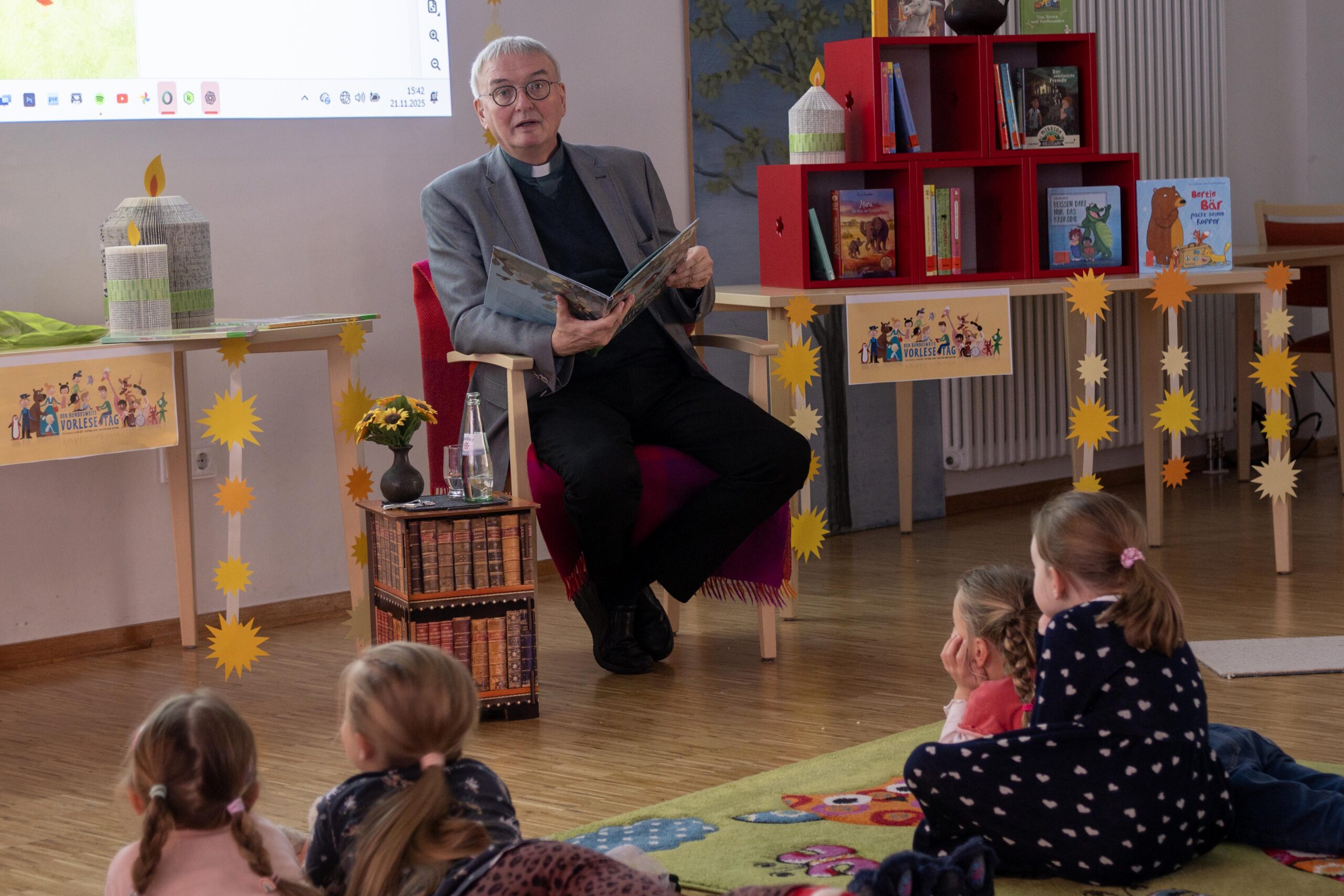 Gleich aus mehreren Bilderbüchern las Generalvikar Thomas Dornseifer den Kindern und deren Eltern vor. Dabei erzeugte er bei „Klein und Groß“ eine gespannte und freudige Aufmerksamkeit. Die Leiterin der Büchereifachstelle des Erzbistums Paderborn, Bibliothekarin Elisabeth Lappe-Oeynhausen, hatte für Generalvikar Dornseifer aktuelle Bilderbücher aus dem Bestand der Katholischen Öffentlichen Büchereien zum Vorlesen und Zeigen ausgewählt. Die Kinder und Eltern hatten sichtlich Freude an der Vorlese-Runde mit dem Generalvikar von Erzbischof Dr. Udo Markus Bentz. Am Ende ehrte KÖB-Mitarbeiter Herbert Cramme Generalvikar Thomas Dornseifer mit einer „Urkunde fürs Vorlesen“ – nach drei Bilderbüchern hatte er diese Würdigung wirklich verdient.