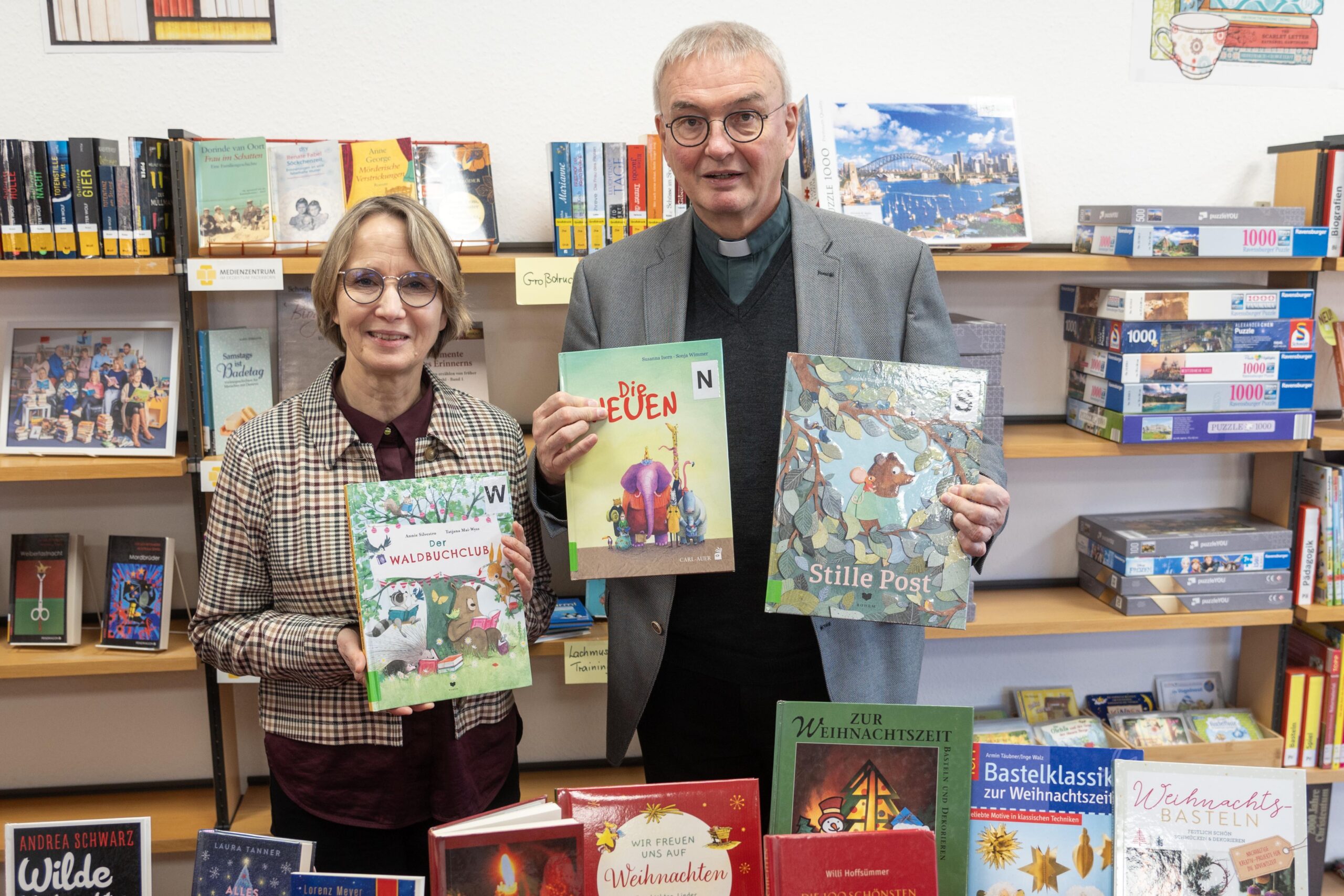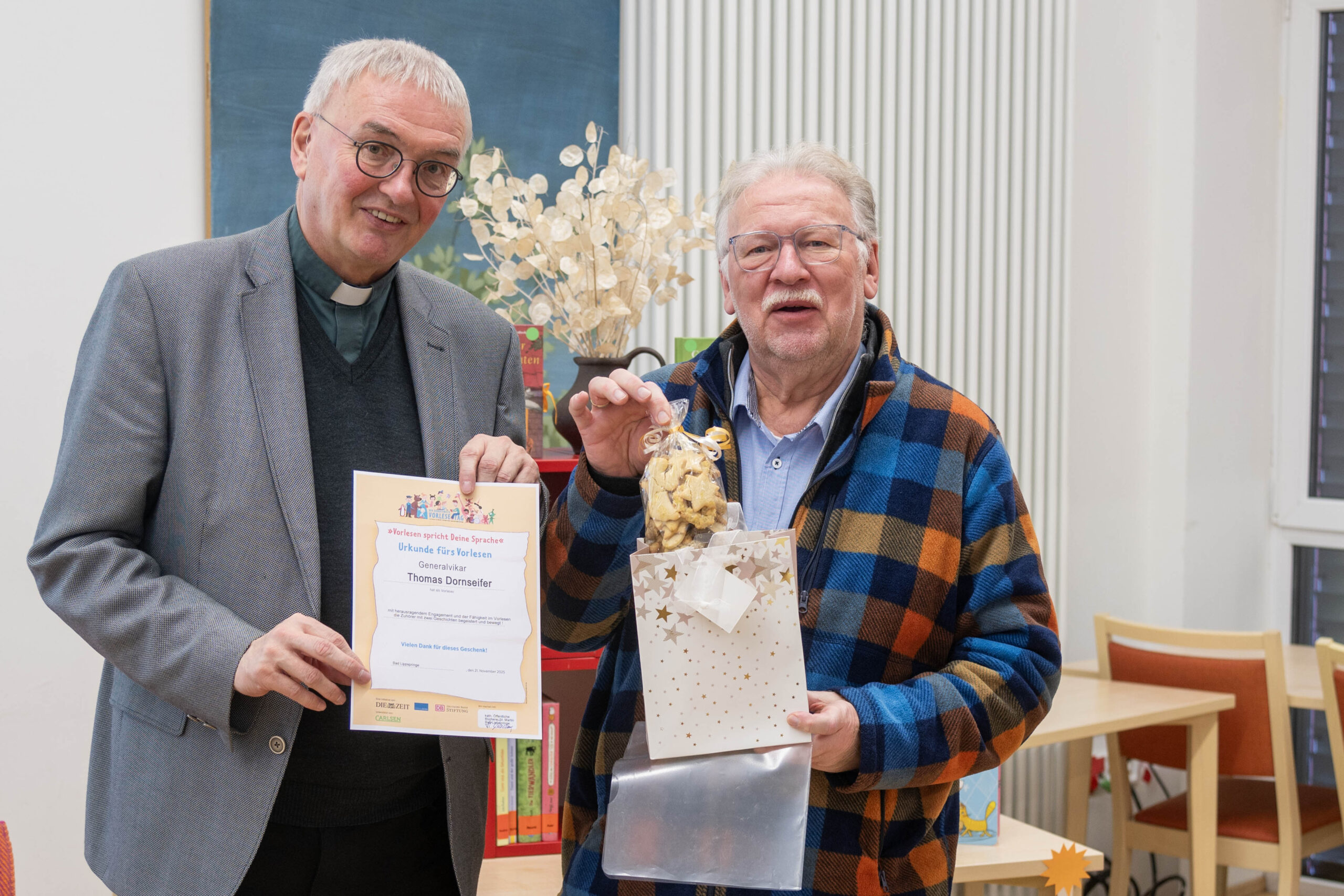 Generalvikar Thomas Dornseifer nutzte die Gelegenheit, sich herzlich bei den Mitarbeiterinnen und Mitarbeitern der Katholischen Öffentlichen Bücherei St. Martin in Bad Lippspringe zu bedanken, ihnen Dank zu sagen für die Organisation und Beteiligung am Bundesweiten Vorlesetag, aber insbesondere für deren großes Engagement in der Bücherei „zum Wohl von Kindern, Jugendlichen, Erwachsenen“. Mit einer mit Süßigkeiten gefüllten GLÜCKLICH/T-Box würdigte Generalvikar Dornseifer die ehrenamtliche Arbeit, nannte die Mitarbeitenden – stellvertretend für alle 1.800 Büchereimitarbeitenden im Erzbistum Paderborn – GLÜCKLICH/Ter, die „über das ganze Jahr Lese-Freude bei ihren Mitmenschen“ ermöglichen. „Vielen Dank für ihr Wirken und Licht-Sein für die Menschen hier.“