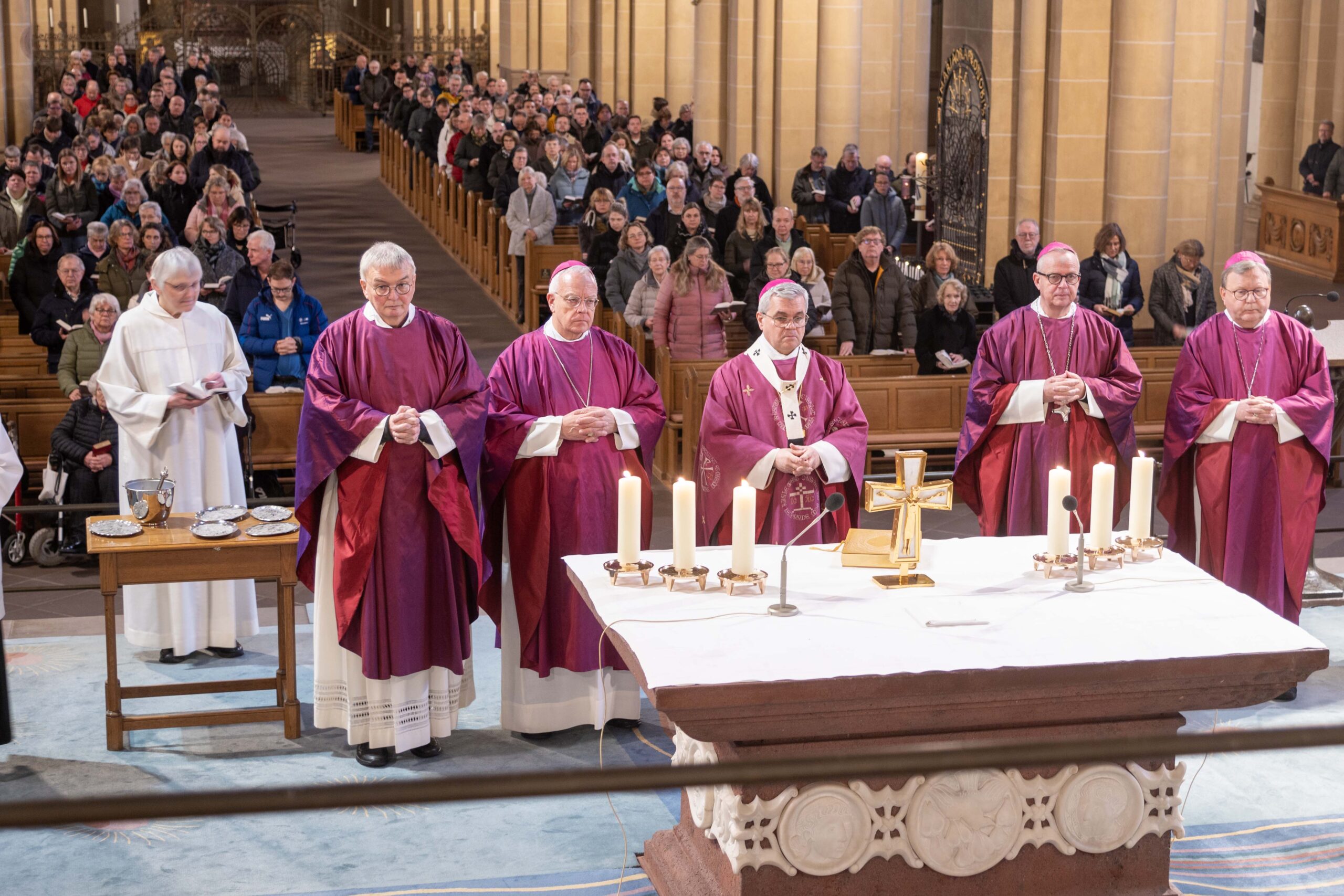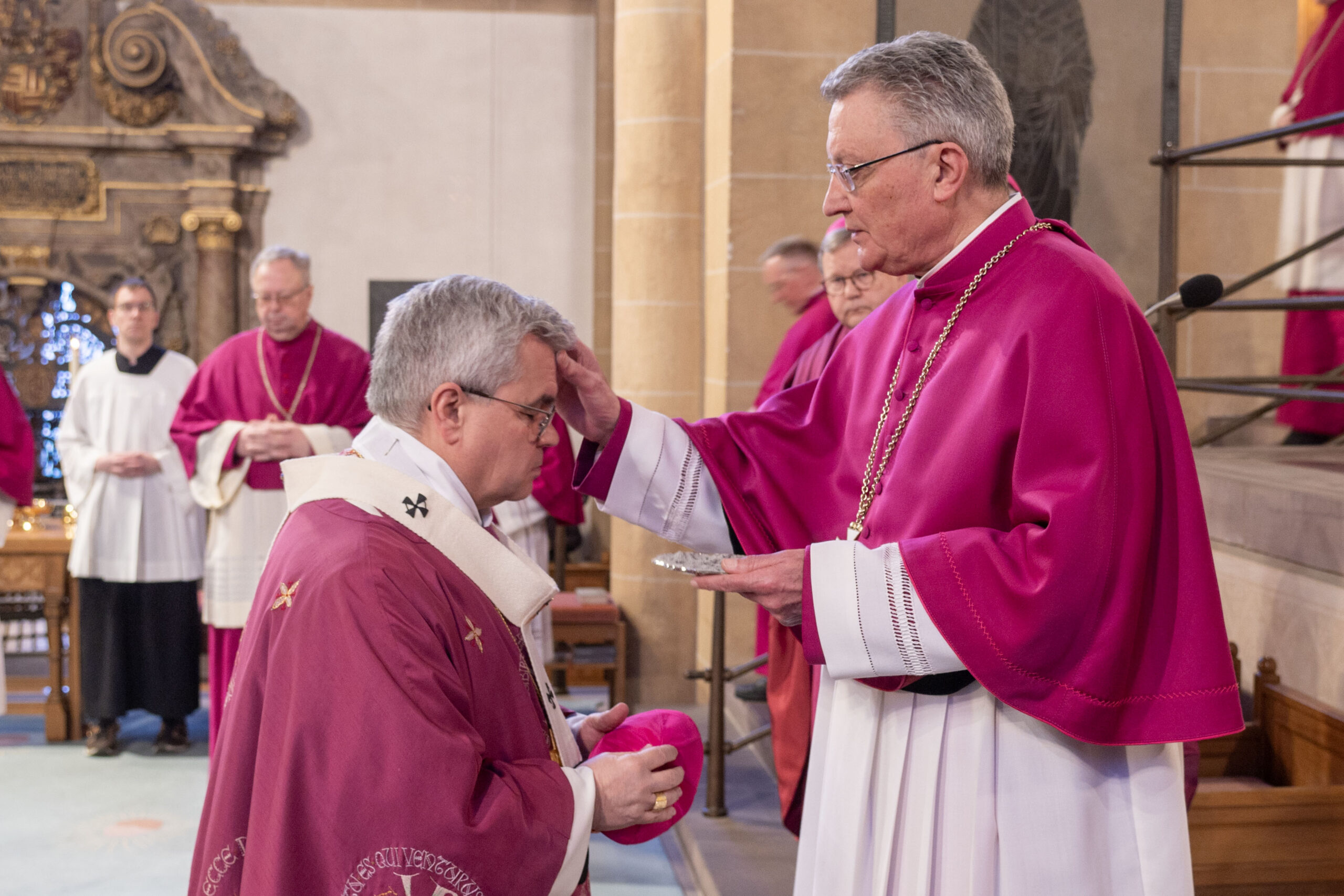 Nach der Predigt segnete Erzbischof Dr. Udo Markus Bentz die Asche, mit der mehrere Priester den Gläubigen im Hohen Dom das Aschekreuz spendeten. Mit den Worten „Bedenke Mensch, dass Du Staub bist und wieder zu Staub zurückkehren wirst“ erhielt jede und jeder Gläubige mit der Asche ein Kreuz auf die Stirn gezeichnet. Erzbischof Dr. Udo Markus Bentz empfing als Erster das Aschekreuz von Dompropst Monsignore Joachim Göbel, bevor der Paderborner Erzbischof dem Dompropst das Kreuz auf die Stirn zeichnete.