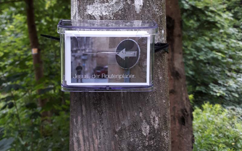Dass Jesus „mitten ins Leben“ gehört, konnte man in Winterberg auch jenseits des Oversums erfahren. Das Ausstellungsteam um Regina Peis hat einzelne Motive als Karten in der Öffentlichkeit ausgelegt. An einer Eisdiele lauteten die Karten „Jesus, der Diätberater“, an einem Wegweiser „Jesus, der Routenplaner“.
