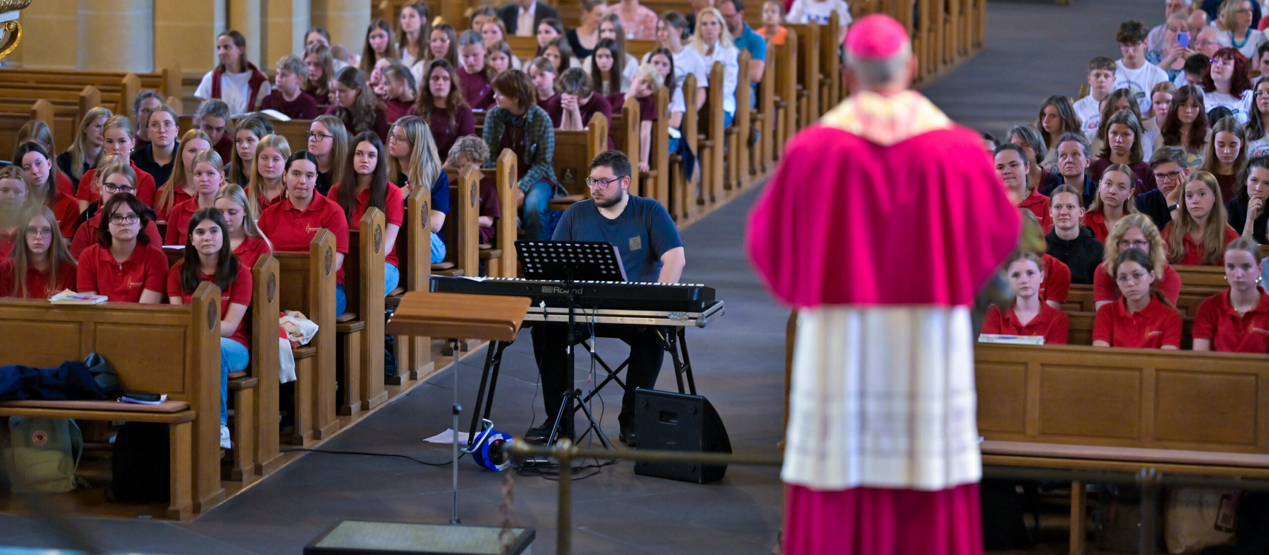 Im Paderborner Dom herrscht Aufbruchstimmung. Mehr als 200 junge Sängerinnen und Sänger machen sich auf den Weg nach München zum 45. Internationalen Kinder- und Jugendchorfestival des Chorverbands Pueri Cantores unter dem Motto „CANTATE DOMINO – Vielstimmig für den Frieden – #comeandsing“. Ausgesendet hat sie Weihbischof Josef Holtkotte in einem feierlichen Gottesdienst, geprägt von musikalischen Klängen des Friedens.