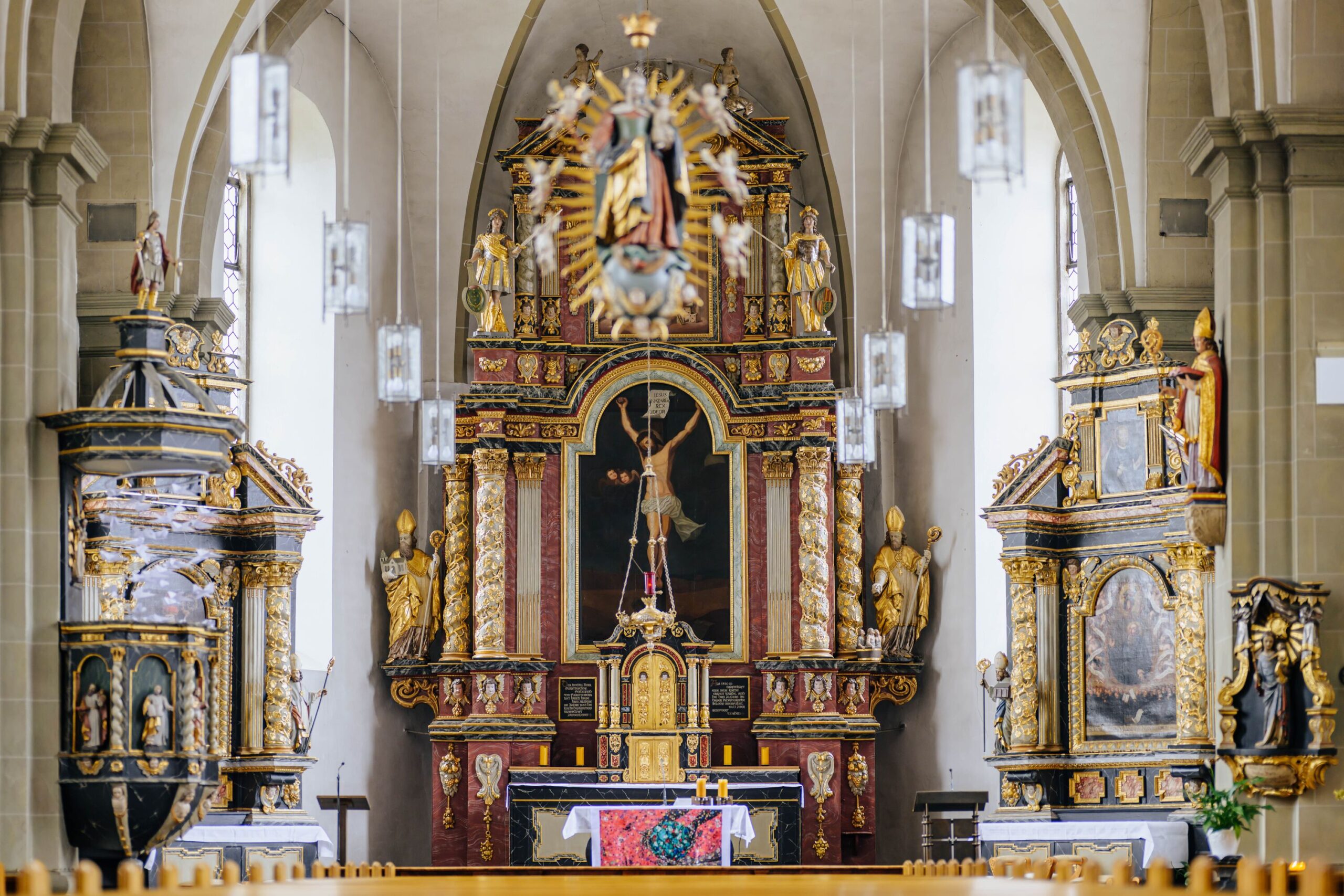 Für dieses Kalenderblatt hat sich Norbert Cruse akribisch vorbereitet und ein dickes Materialpaket zusammengestellt. Neben einem gedruckten Kirchenführer enthält es Farbkopien von Zeitungsausschnitten, die bis in die frühen 1990er-Jahre zurückreichen. Dazu kommt eine Kopie des „Propstei-Boten“ vom 6. September 1959 mit einem Bericht über die seinerzeit aktuelle Generalsanierung und darüber, wie die meterdicken Pfeilervorlagen der Barockkirche aufgestemmt und mit zehn Meter hohen Stahlbetoneinlagen stabilisiert wurden.