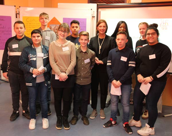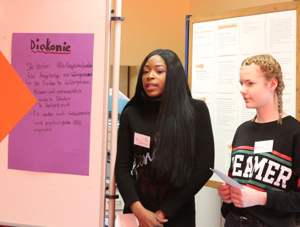 Schülerinnen und Schüler der Jahrgangsstufe 9 aus unterschiedlichen Religionen und Konfessionen präsentierten ihre Auseinandersetzung mit dem Thema „Caritas/Diakonie“.pdp/Maria Aßhauer10 Schülerinnen und Schüler des 9. Jahrgangs – evangelische, katholische und orthodoxe Christen ebenso wie Jesiden und Muslime – erwarteten die Ministerin mit einer Präsentation von Ergebnissen aus dem konfessionell-kooperativen Religionsunterricht. Mit ein wenig Lampenfieber, aber sehr überzeugend präsentierten sie ihre Auseinandersetzung mit den Werken der Barmherzigkeit und den konkreten Formen der Caritas und Diakonie – mit der simplen Erkenntnis: Die Unterschiede zwischen katholischer Caritas und evangelischer Diakonie sind gar nicht so groß.