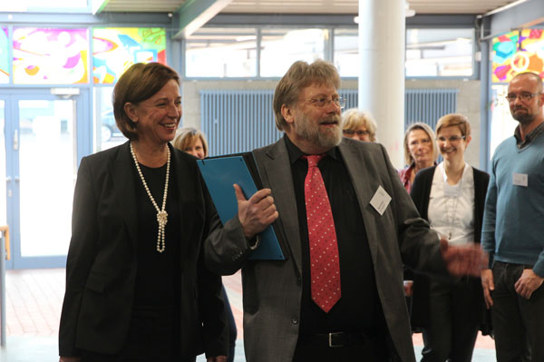 Gang durch die Schule mit dem stellvertretenden Schulleiter Bernd Höner: Die Architektur und Schüler-Kunst an den Wänden beeindruckten Ministerin Yvonne Gebauer sichtlich.pdp/Maria AßhauerKonfessionell-kooperativer Religionsunterricht ermöglicht ein Nachdenken über die eigene Religiosität und eine Auseinandersetzung mit der anderen Konfession. Unter dem inhaltlichen Motto „Gemeinsamkeiten stärken – Unterschieden gerecht werden“ fördert er den Dialog und ist damit ein Beispiel gelebter Ökumene. „Der konfessionell-kooperative Religionsunterricht führt nicht nur zu einer inhaltlichen und strukturellen Stärkung. Er vertieft und erneuert zugleich den Dialog zwischen den Kirchen und den Religionslehrkräften“, erklärt Roland Gottwald, zuständiger Schulrat i.K. im Erzbischöflichen Generalvikariat Paderborn.