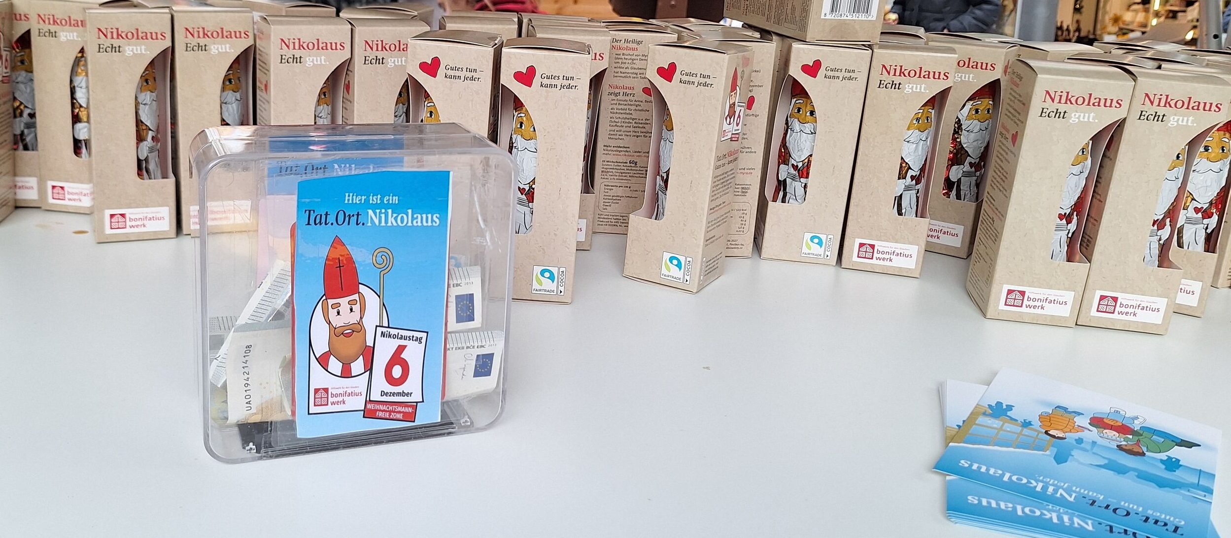 Lebensmittel, Lohnkosten, Heizung, Gebäudereinigung – an so vielen Stellen sind für die Wärmestube St. Nikolai Gelder über die Betriebskosten hinaus nötig und schnell ausgegeben. Dompropst Roland Falkenhahn: „Die Wärmestube St. Nikolai ist im Heiligen Jahr 2025 unser Ort der Hoffnung. Mit jeder Spende geben wir Menschen auf der Straße ein Licht in der Adventszeit, denn ein Nikolaus kann mehr sein als Schokolade.“ Für die Verteil-Aktion in der Stadt gab es 400 hochwertige „Boni“-Schokoladennikoläuse vom Bonifatiuswerk. Das Erzbistum steuerte weitere 500 Nikoläuse dazu, die Mitarbeitenden aus der Gemeinde und von der Caritas verteilten. “So haben wir auf die Wärmestube aufmerksam gemacht“, sagt Susanne Leimbach. Sie hofft, dass die Aktion nachwirkt.