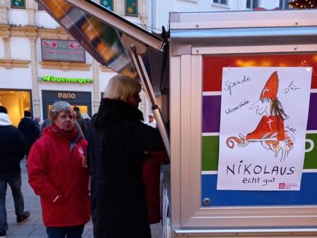 Die Mindener Aktiven verteilten Nikoläuse des Bonifatiuswerkes in der Stadt und sammelten dabei Spenden für die Wärmestube. Wofür sie sind? Die Antwort ist schlicht und kommt prompt: „Damit die Türen der Wärmestube weiterhin geöffnet bleiben“, sagt Susanne Leimbach, Vorständin beim Caritasverband Minden, und gleichzeitig Geschäftsführerin beim Sozialdienst katholischer Frauen (SkF). „Jede Spende, ob groß oder klein, hilft uns, den Betrieb der Wärmestube St. Nikolai auch weiterhin sicherzustellen. Dass die Wärmestube im Heiligen Jahr zum Ort der Hoffnung für Menschen auf der Straße erklärt wurde, ist für uns zugleich Anerkennung und Auftrag“, pflichtet Yvonne Johann, Leiterin der Wärmestube, bei. Ebenso wie Susanne Leimbach verteilte und sammelte sie am ersten Advent fleißig mit.