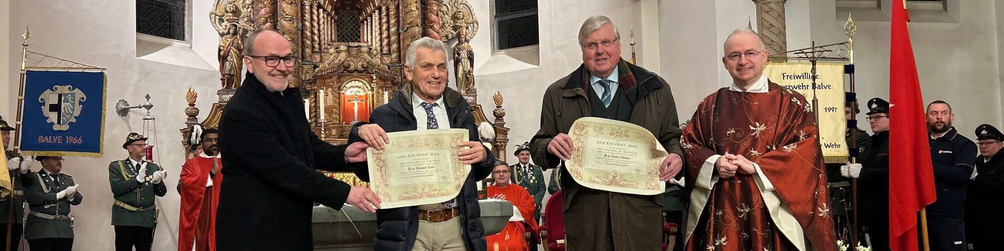 Im Rahmen eines feierlichen Gottesdienstes in der Pfarrkirche St. Blasius hat Dechant Andreas Schulte zwei päpstliche Ehrenkreuze „Pro Ecclesia et Pontifice“ verliehen. Ausgezeichnet wurden Bruno Köck und Paul Stüeken für ihr herausragendes ehrenamtliches Wirken zum Wohl der katholischen Kirche und der Gemeinde in Balve.