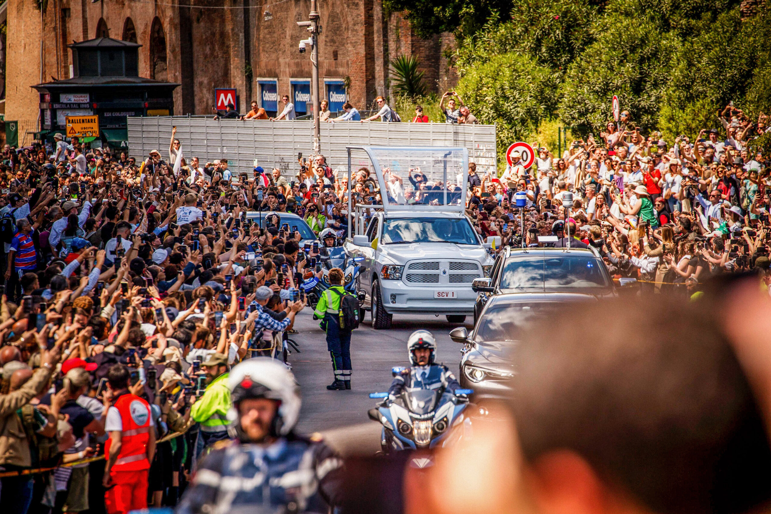 Menschenmenge an der Straße, auf der das Papamobil mit dem Sarg von Papst Franziskus fährt, vor dem Kolosseum auf dem Weg zur Kirche Santa Maria Maggiore, am 26. April 2025 in Rom (Italien).