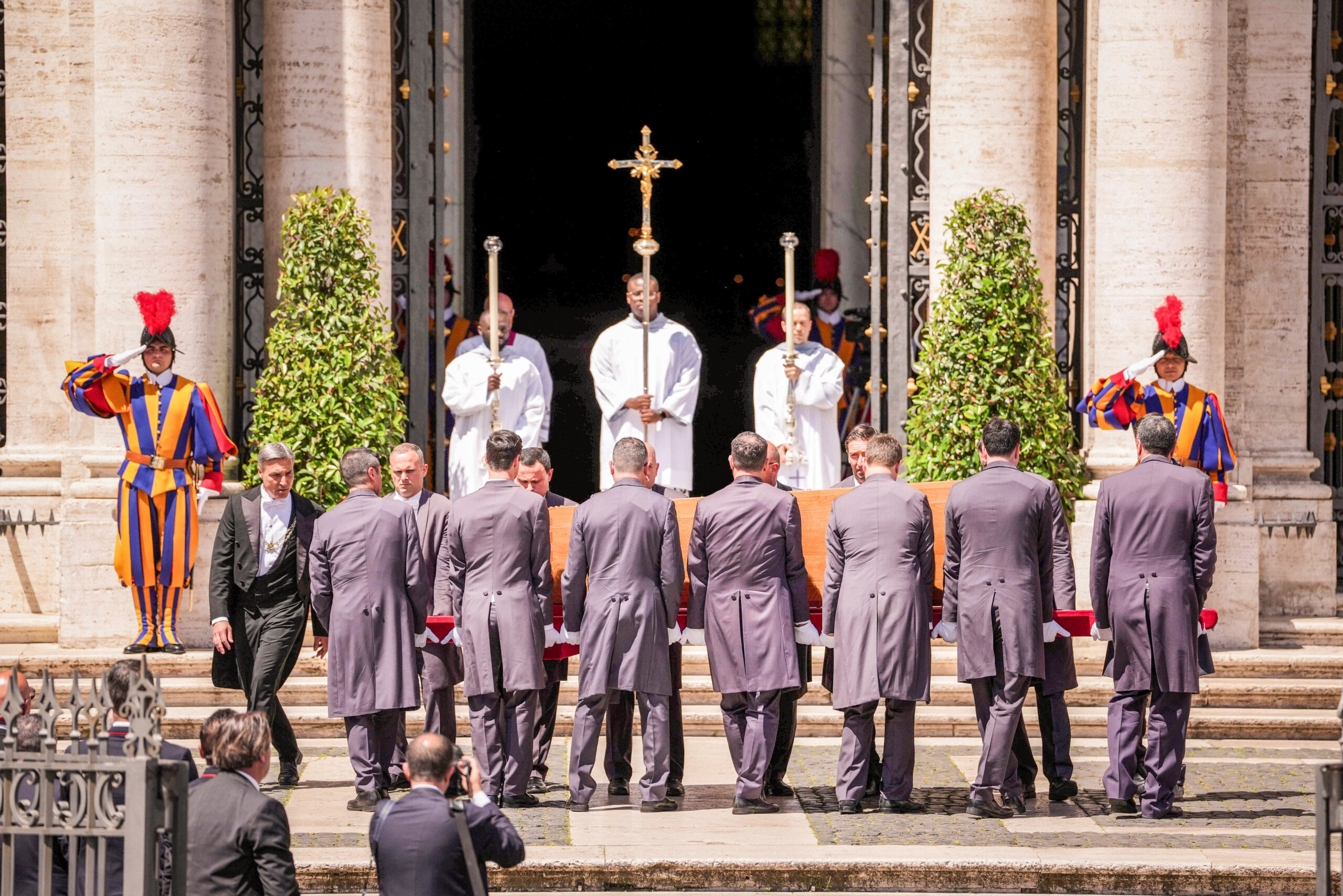 Sargträger tragen den Sarg mit dem Leichnam von Papst Franziskus zu einem Requiem am 26. April 2025 auf den Petersplatz im Vatikan.