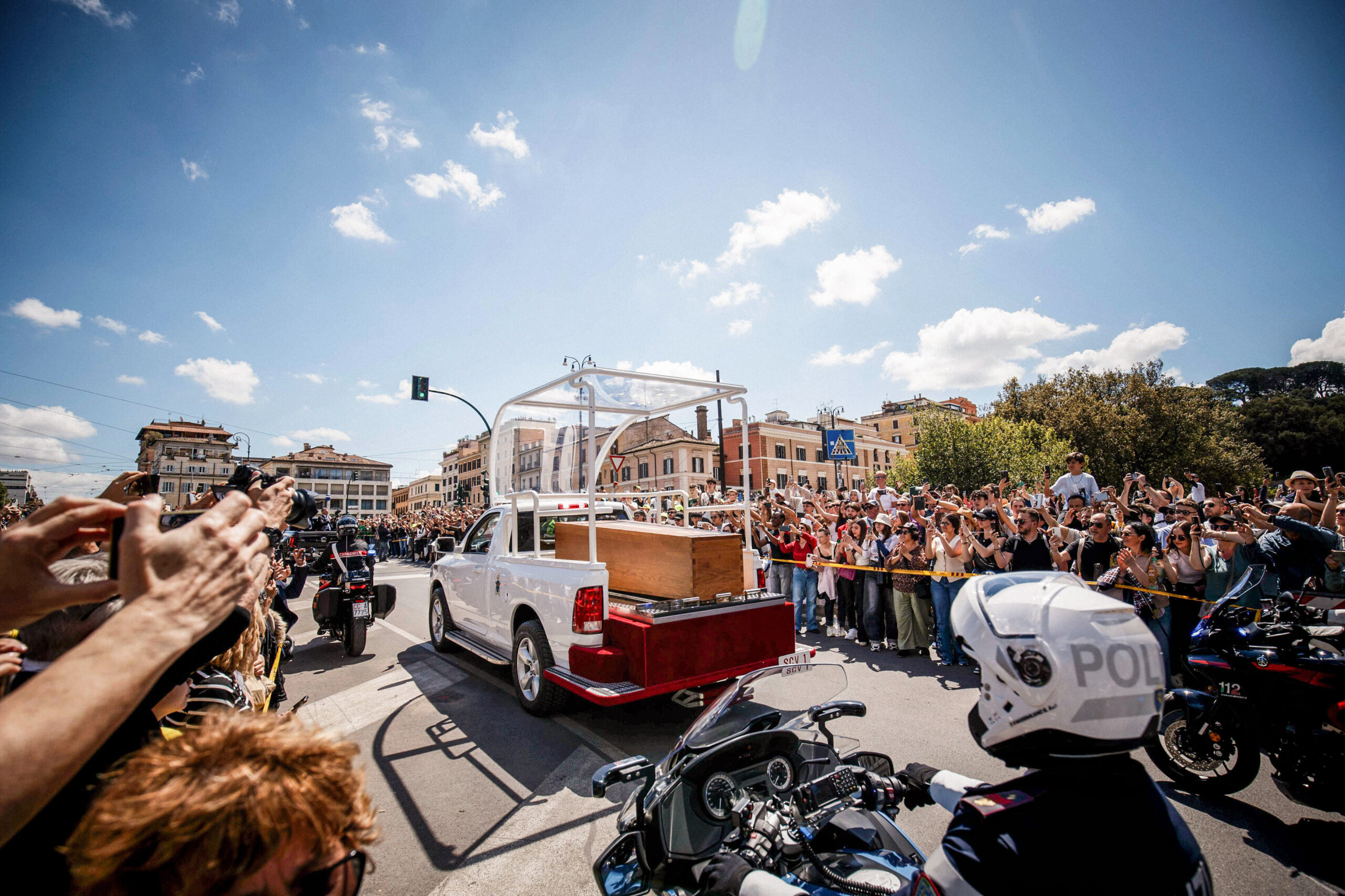 Menschen am Straßenrand, in der Mitte das Papamobil mit dem Sarg von Papst Franziskus, auf dem Weg zur Kirche Santa Maria Maggiore, am 26. April 2025 in Rom (Italien).