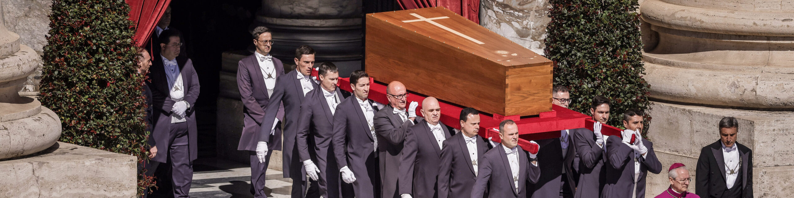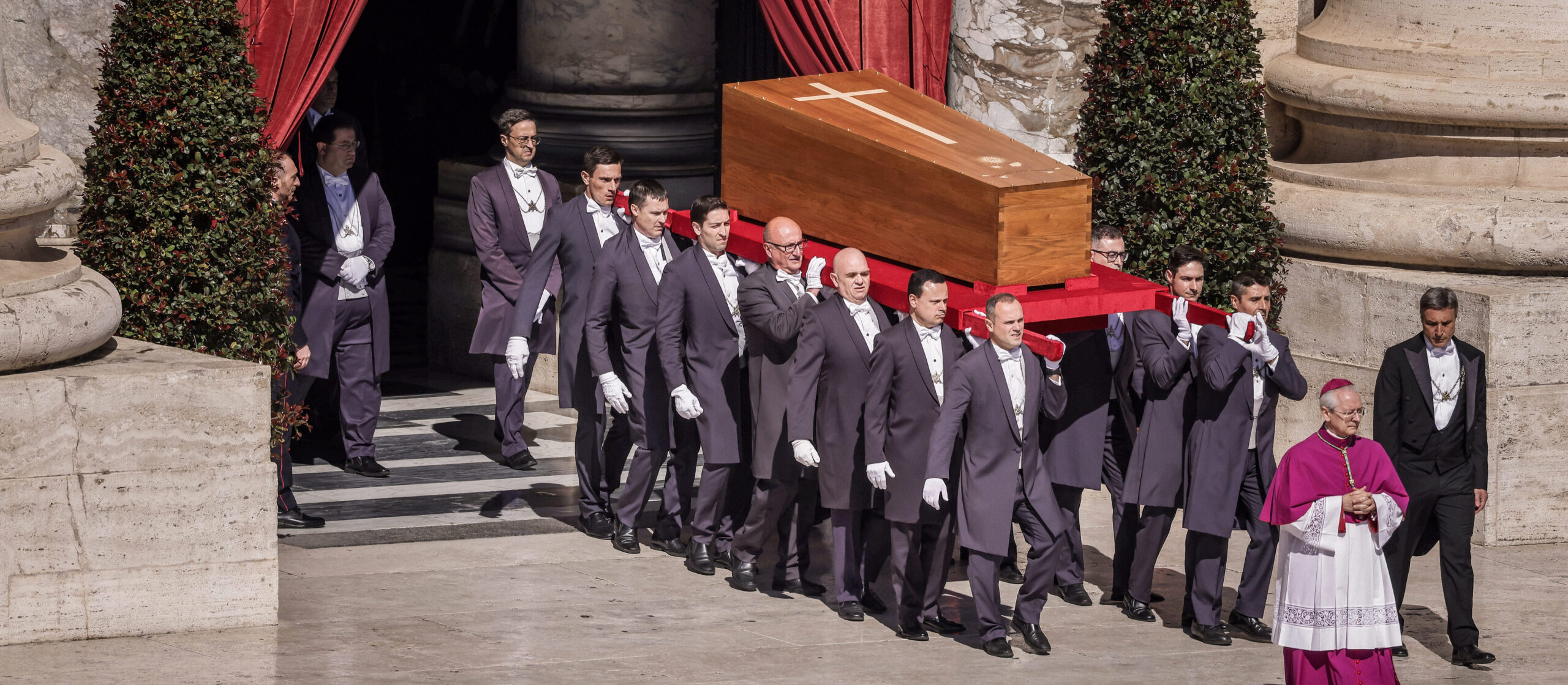 Sargträger tragen den Sarg mit dem Leichnam von Papst Franziskus aus dem Petersdom zu einem Requiem, vorne Erzbischof Diego Giovanni Ravelli (2.v.r.), Zeremonienmeister der päpstlichen liturgischen Feiern, am 26. April 2025 auf den Petersplatz im Vatikan.