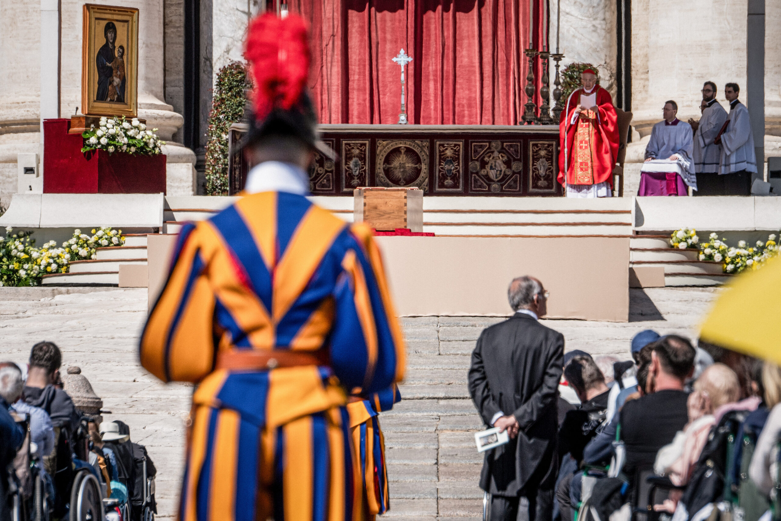Kardinal Giovanni Battista Re, Dekan des Kardinalskollegiums (m.r.), vor dem Sarg mit dem Leichnam von Papst Franziskus während eines Requiems am 26. April 2025 auf dem Petersplatz im Vatikan.
