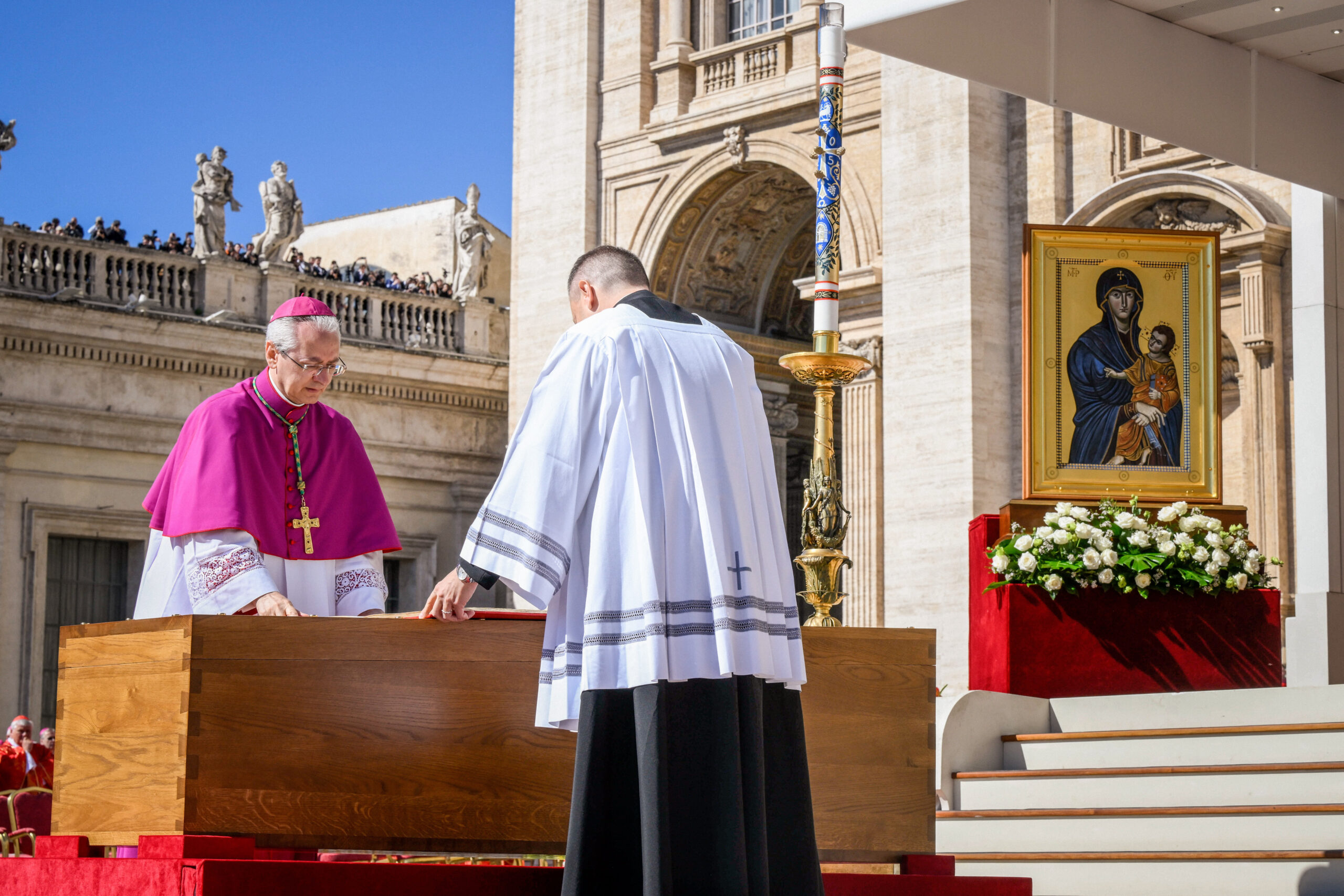 Erzbischof Diego Giovanni Ravelli (l.), Zeremonienmeister der päpstlichen liturgischen Feiern, steht vor dem Sarg mit dem Leichnam von Papst Franziskus bei einem Requiem am 26. April 2025 auf den Petersplatz im Vatikan.