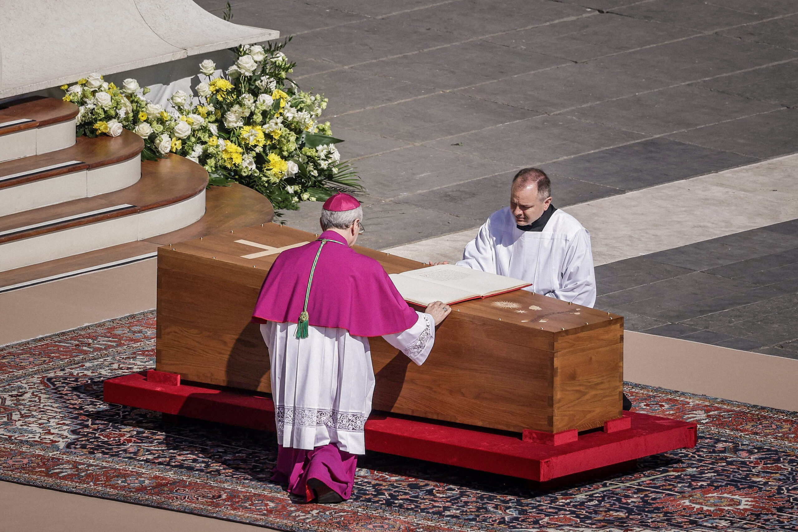 Erzbischof Diego Giovanni Ravelli (l.), Zeremonienmeister der päpstlichen liturgischen Feiern, kniet vor dem Sarg mit dem Leichnam von Papst Franziskus bei einem Requiem am 26. April 2025 auf den Petersplatz im Vatikan.